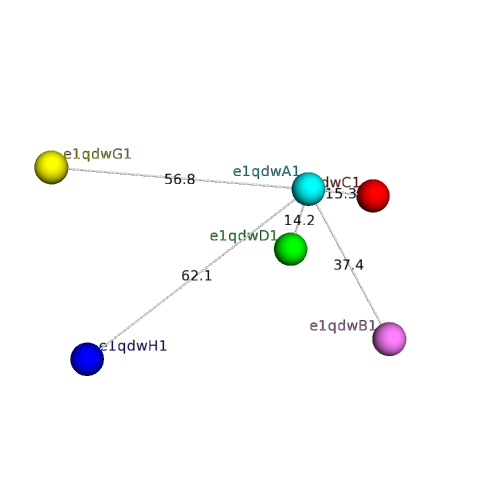 The domain and its neighboring domains (both within the asymmetric unit and to crystallographic symmetry mates) are represented by spheres and linked by lines. Distances between the center of the domain and interfaces are shown for each contact.