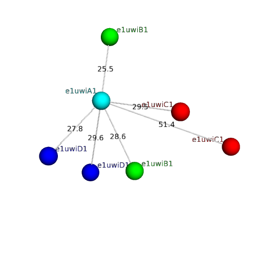 The domain and its neighboring domains (both within the asymmetric unit and to crystallographic symmetry mates) are represented by spheres and linked by lines. Distances between the center of the domain and interfaces are shown for each contact.