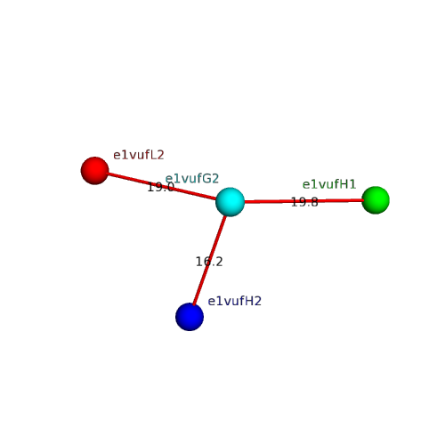 The domain and its neighboring domains (both within the asymmetric unit and to crystallographic symmetry mates) are represented by spheres and linked by lines. Distances between the center of the domain and interfaces are shown for each contact.