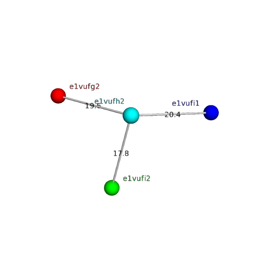The domain and its neighboring domains (both within the asymmetric unit and to crystallographic symmetry mates) are represented by spheres and linked by lines. Distances between the center of the domain and interfaces are shown for each contact.