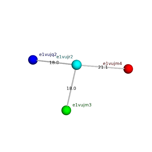 The domain and its neighboring domains (both within the asymmetric unit and to crystallographic symmetry mates) are represented by spheres and linked by lines. Distances between the center of the domain and interfaces are shown for each contact.