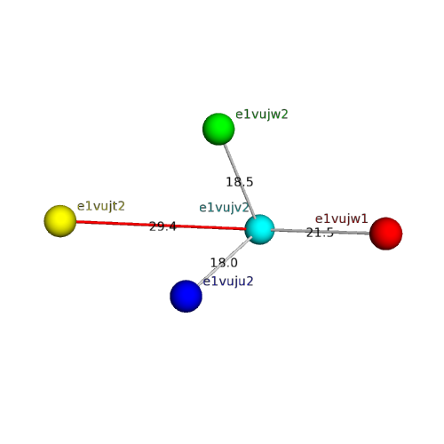 The domain and its neighboring domains (both within the asymmetric unit and to crystallographic symmetry mates) are represented by spheres and linked by lines. Distances between the center of the domain and interfaces are shown for each contact.