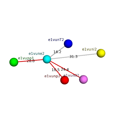 The domain and its neighboring domains (both within the asymmetric unit and to crystallographic symmetry mates) are represented by spheres and linked by lines. Distances between the center of the domain and interfaces are shown for each contact.