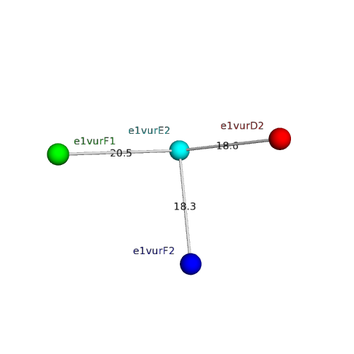 The domain and its neighboring domains (both within the asymmetric unit and to crystallographic symmetry mates) are represented by spheres and linked by lines. Distances between the center of the domain and interfaces are shown for each contact.