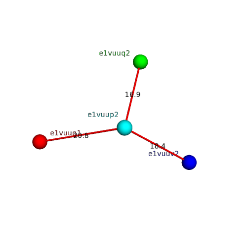 The domain and its neighboring domains (both within the asymmetric unit and to crystallographic symmetry mates) are represented by spheres and linked by lines. Distances between the center of the domain and interfaces are shown for each contact.