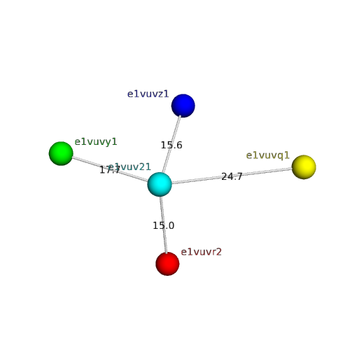 The domain and its neighboring domains (both within the asymmetric unit and to crystallographic symmetry mates) are represented by spheres and linked by lines. Distances between the center of the domain and interfaces are shown for each contact.