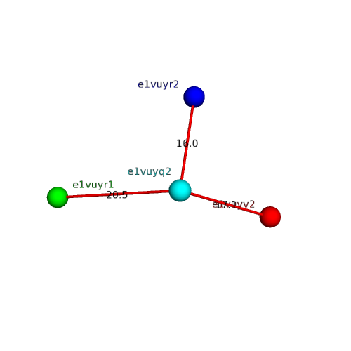 The domain and its neighboring domains (both within the asymmetric unit and to crystallographic symmetry mates) are represented by spheres and linked by lines. Distances between the center of the domain and interfaces are shown for each contact.