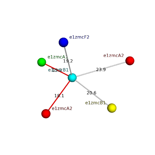 The domain and its neighboring domains (both within the asymmetric unit and to crystallographic symmetry mates) are represented by spheres and linked by lines. Distances between the center of the domain and interfaces are shown for each contact.