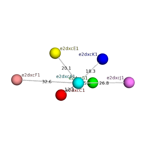 The domain and its neighboring domains (both within the asymmetric unit and to crystallographic symmetry mates) are represented by spheres and linked by lines. Distances between the center of the domain and interfaces are shown for each contact.