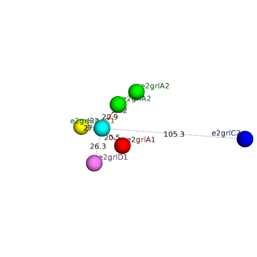 The domain and its neighboring domains (both within the asymmetric unit and to crystallographic symmetry mates) are represented by spheres and linked by lines. Distances between the center of the domain and interfaces are shown for each contact.