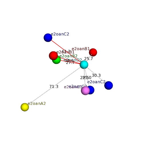 The domain and its neighboring domains (both within the asymmetric unit and to crystallographic symmetry mates) are represented by spheres and linked by lines. Distances between the center of the domain and interfaces are shown for each contact.