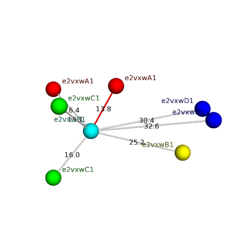 The domain and its neighboring domains (both within the asymmetric unit and to crystallographic symmetry mates) are represented by spheres and linked by lines. Distances between the center of the domain and interfaces are shown for each contact.