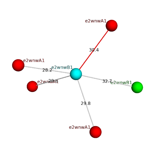 The domain and its neighboring domains (both within the asymmetric unit and to crystallographic symmetry mates) are represented by spheres and linked by lines. Distances between the center of the domain and interfaces are shown for each contact.