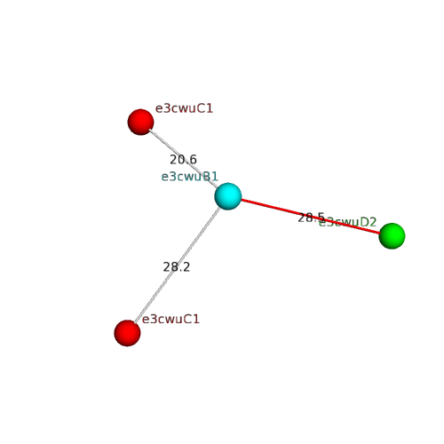 The domain and its neighboring domains (both within the asymmetric unit and to crystallographic symmetry mates) are represented by spheres and linked by lines. Distances between the center of the domain and interfaces are shown for each contact.