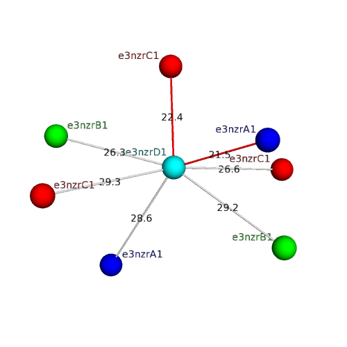 The domain and its neighboring domains (both within the asymmetric unit and to crystallographic symmetry mates) are represented by spheres and linked by lines. Distances between the center of the domain and interfaces are shown for each contact.