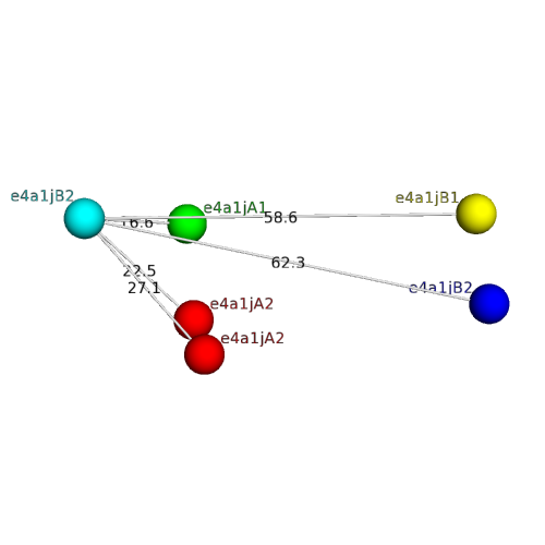 The domain and its neighboring domains (both within the asymmetric unit and to crystallographic symmetry mates) are represented by spheres and linked by lines. Distances between the center of the domain and interfaces are shown for each contact.