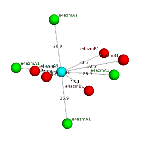 The domain and its neighboring domains (both within the asymmetric unit and to crystallographic symmetry mates) are represented by spheres and linked by lines. Distances between the center of the domain and interfaces are shown for each contact.