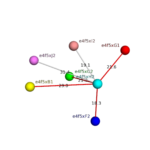The domain and its neighboring domains (both within the asymmetric unit and to crystallographic symmetry mates) are represented by spheres and linked by lines. Distances between the center of the domain and interfaces are shown for each contact.