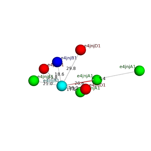The domain and its neighboring domains (both within the asymmetric unit and to crystallographic symmetry mates) are represented by spheres and linked by lines. Distances between the center of the domain and interfaces are shown for each contact.